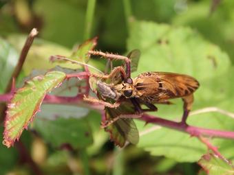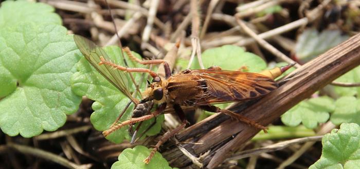 En ce début d’automne, la Tipule est une proie facile pour l’Asile frelon (Asilus crabroniformis). Elle pullule en effet sur les prairies comme au jardin. L’attaque en vol ne lui laisse aucune chance. Aussitôt plaquée au sol, elle est enserrée par de puissantes pattes épineuses. Impossible de se débattre. Le solide rostre noir perce alors le thorax pour en siphonner les fluides internes.