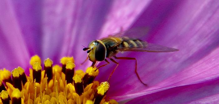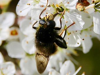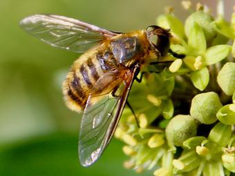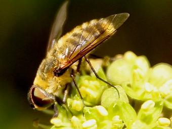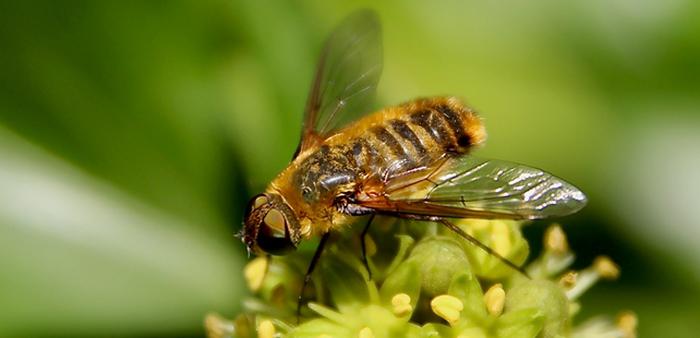 On jurerait une grosse abeille. Mais la tête demi-sphérique et les grands yeux bruns aux reflets verdâtres en témoignent : c’est bien une mouche !
