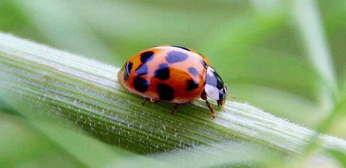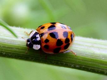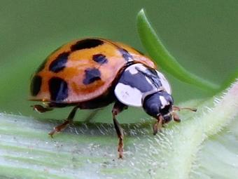La Coccinelle asiatique (Harmonia axyridis) peut compter jusqu’à dix-neuf points ! Carton plein pour celle-ci en inspection sur un pied de cosmos. Un à l’arrière, deux fois trois au centre et deux à l’avant sur chaque élytre. Le dix-neuvième ? Juste à l’arrière du pronotum, à la jonction des deux élytres.