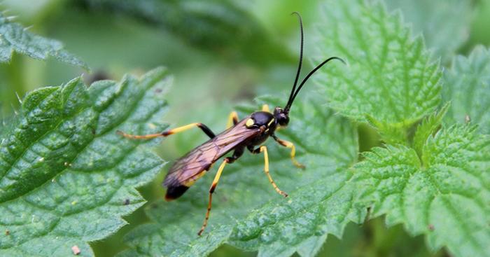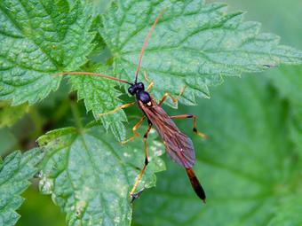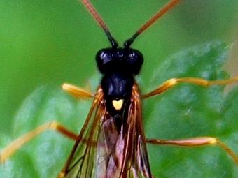 Un proche parent également parasite des chenilles. Le Diphyus palliatrius aux antennes noires et aux tibias jaune vif. Pas de petit coeur mais un trapèze à l'arrière du thorax. Et, surtout, un abdomen plus court et plus massif, rayé de jaune.
