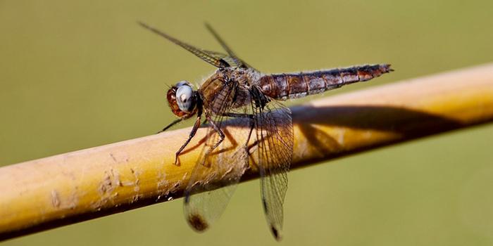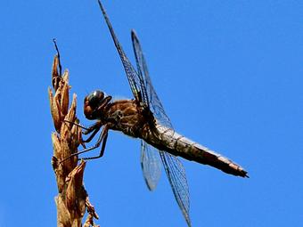 Loin de l’orangé de Madame, l’abdomen de Monsieur est ainsi brun sombre, recouvert d’une pruine bleue qui finit par s’estomper avec l’âge. Et les yeux, non pas brun roux, sont ici beaucoup plus clairs, hésitant entre gris et bleu.