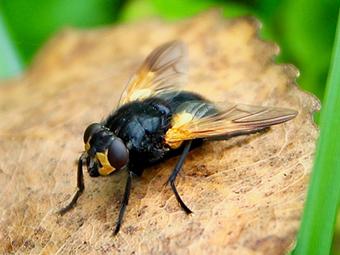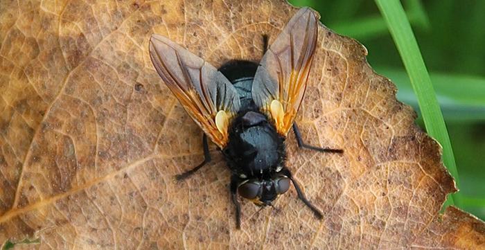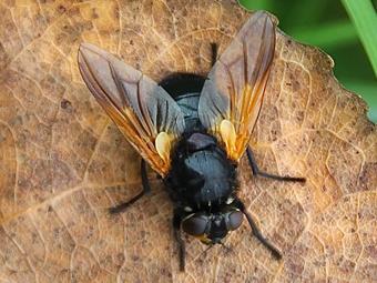 Elle est tout de même moins rondelette que l’Échinomye corpulente à laquelle elle ressemble beaucoup. Et pas de « cagoule » jaune pour la Mouche mésembrine (Mesembrina meridiana), alias la Mouche de midi ! La tête et les antennes sont à l’unisson du reste du corps. Noires. Avec des « joues » jaune orangé pour seule exception. Comme un écho à la naissance joliment dorée des ailes par ailleurs légèrement fumées.