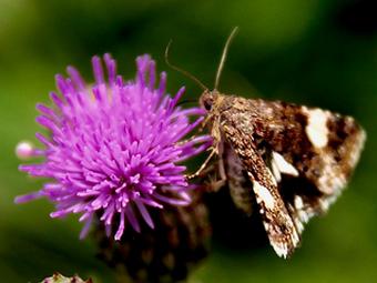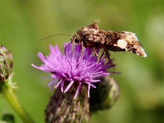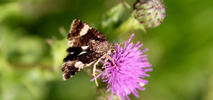 On pourrait presque la confondre avec l’Hespérie des potentilles. Du moins en face dorsale. Mais les antennes sont ici effilées quand celles des hespéries présentent une pointe renflée et légèrement crochue. Nocturne, comme la plupart des noctuelles, il n’est cependant pas rare de voir la Funèbre butiner au soleil. Elle sirote ici le nectar d’une des dernières inflorescences de Cirse des marais. Mais il lui faut se faire une raison : c’est bientôt la fin.