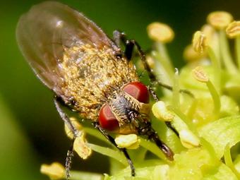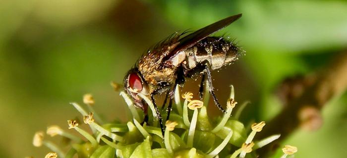 Encore une mouche mal aimée ! On aimerait lui trouver quelque vertu. Va pour pour ses qualités de butineuse. Ici sur l’incontournable lierre. Sinon, la mauvaise réputation de la Pollénie du lombric (Pollenia rudis) tient surtout à son comportement automnal. Elle recherche en effet un refuge jusque dans les habitations pour passer l’hiver. Parfois en grand nombre. D’où son sobriquet, la Mouche des greniers.