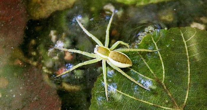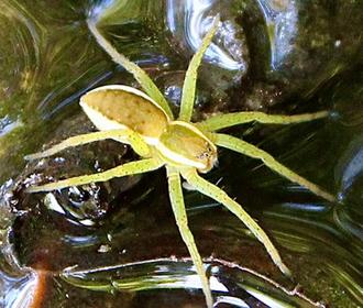 Aussi à l’aise sur l’eau que dans la végétation des berges ! La Dolomède commune (Dolomedes fimbriatus), alias l’Araignée des marais, prend place ici sur les cailloux d’un gué, là sur une feuille morte à la dérive. Elle peut ainsi « pêcher » larves, mollusques et mêmes alevins, tout en restant relativement l’abri des prédateurs…