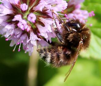 Ici la fourrure du thorax est marron très soutenu. Mâtinée de roux sous le soleil. Et les tergites noirs de l’abdomen sont bordés de poils bruns allant s’éclaircissant vers la pointe.