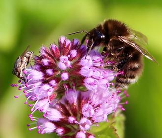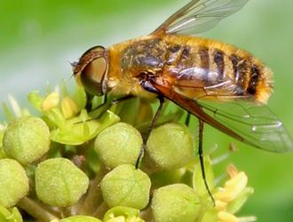 Avec près de trois centimètres de long, ce syrphe imposant est en effet bluffant lorsqu’il patrouille, lourd et bruyant, de fleur en fleur. Rien à voir avec la silhouette plus massive et la grande vivacité de la volucelle.