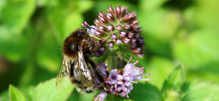On songe tout d’abord à l’Abeille charpentière. Mais le noir est moins profond et les ailes, sans reflet bleu métallique, sont simplement légèrement fumées. Voilà plutôt, presqu’aussi bruyant, le Bourdon variable dans sa forme la plus sombre (Bombus humilis tristis).
