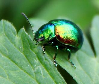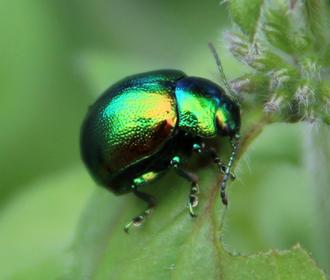 On a déjà rencontré au jardin la belle rouge et noire Chrysomèle du peuplier. Voici une de ses cousines. La Chrysomèle de la menthe (Chrysolina menthastri), beaucoup plus menue (7/8 mm) et d’un superbe vert métallique aux reflets cuivrés.