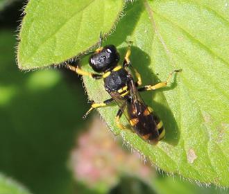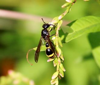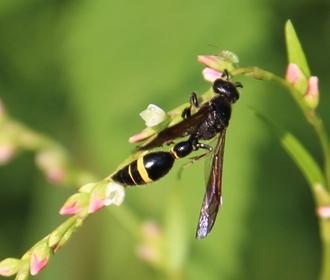 Parmi les guêpes maçonnes du jardin, on se souvient du petit Eumène pomiforme et de son cousin au format XXL, l’impressionnant Eumène unguiculé. Dans une taille intermédiaire, voici le sobre Discoellius zonalis, un euménide plutôt rare. Ici sur la Renouée poivre d’eau.