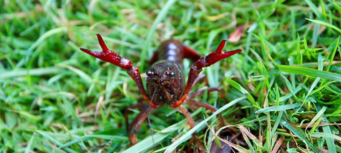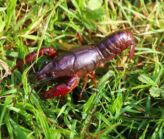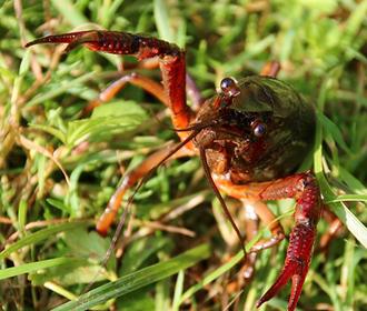 Autant elle peut être vive dans l’eau, même très basse, autant elle semble se traîner parmi les herbes de cette prairie voisine du jardin. Sans doute la traverse-t-elle pour passer d’un fossé à l’autre. Maculée de vase, elle hésite entre gris et brun, mais s’illumine de rouge au moindre rayon de soleil : une Écrevisse de Louisiane (Procambarus clarkii).