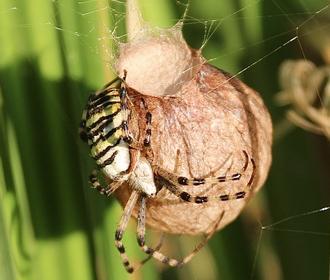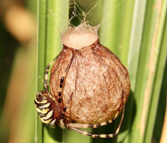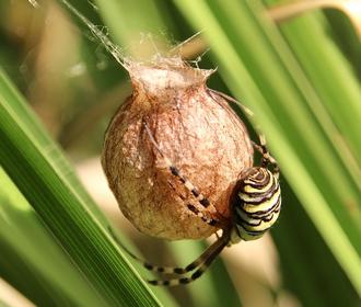Fasciée Décidément, l’Argiope frelon (Argiope bruennichi), alias l’Épeire fasciée, ne ressemble à aucune autre araignée. On connaissait sa livrée rayée blanc-jaune-noir et l’étrange « zigzag » de sa toile. Voici son étonnant cocon en ferme de montgolfière retournée ! Un petit chef d’œuvre qui annonce l’arrivée vue l’automne. Car, mine de rien, si l’été semble s’éterniser, les jours raccourcissent et les nuits sont frisquettes. Madame Argiope sent bien que le moment est venu de passer le relais. Pondre, évidemment, mais pas n’importe comment. Ni n’importe où. Alors, en une nuit, avec un mystérieux savoir-faire, elle a tissé sa superbe nurserie. Suspendue à de grandes feuilles jaunissantes de carex. Au petit matin, elle s’y agrippe encore comme pour la protéger. Avant bientôt, se laisser mourir… L’enveloppe de soie a déjà commencé à durcir et brunir. Les mauvais jours peuvent venir, le cocon sera invisible parmi les herbes sèches. Plusieurs centaines d’œufs puis de petites larves passeront l’hiver dans cette carapace imperméable et douillettement feutrée. Si tout va bien, elles en émergeront début mai.