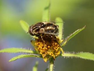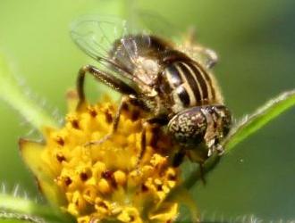 Souvent de belle taille, comme l’Éristale tenace, les membres de la tribu présentent parfois une livrée ornée de jaune vif, comme l’Éristale des fleurs. Voilà donc l’exception qui confirme la règle. L’Éristale bronzé (Eristalinus aeneus) est courtaud (7/8 mm) avec, comme son nom le suggère, une dominante luisante plutôt sombre.