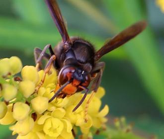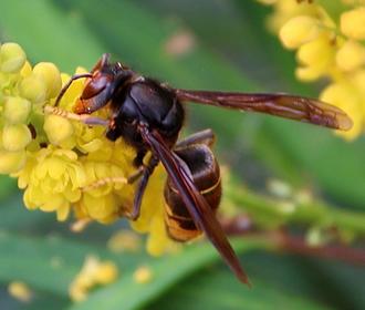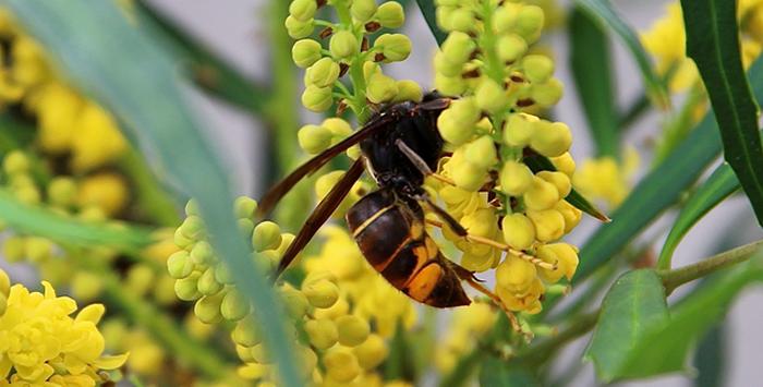L’appétence du frelon asiatique pour le Mahonia confusa s’explique peut-être par leur origine commune. En effet, si quelques espèces de mahonias proviennent d’Amérique du Nord, confusa est un cultivar obtenu par croisements de plusieurs espèces asiatiques, notamment chinoises. Bien qu’acclimaté depuis belle lurette à l’Europe, au point d’y devenir invasive, le grand frelon orange et noir est-il sentimental à ce point qu’il ne résiste pas au parfum « du pays » ?