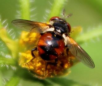 Chez les « Mouches coccinelles », l’abdomen est bien rond, luisant, jaune ou rouge orangé, orné d’une ligne médiane de figures géométriques noires. Des petites taches circulaires le plus souvent. D’où l’allusion aux coccinelles. Plutôt des triangles et des losanges pour ce Gymnosome. Peut-être Gymnosoma nudifrons.
