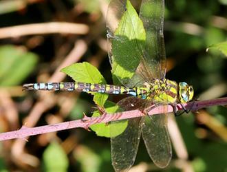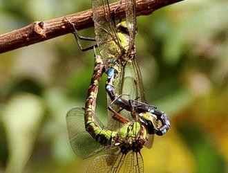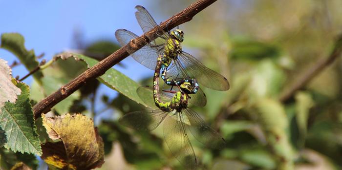 C’est, avec le Sympétrum rayé notamment, une des libellules les plus tardives du marais. Bien sûr, le gros de la troupe de l’Æschne bleue (Aeshna cyanea) est estival, mais quelques individus font ainsi de la résistance jusqu’à la mi-novembre… Et, jusqu’au bout, ils n’ont de cesse que de trouver l’âme sœur. Plutôt deux fois qu’une !