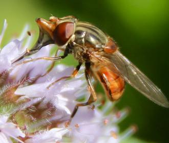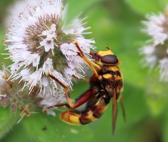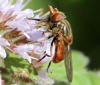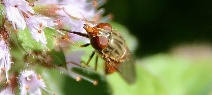 Avec pareil équipement, l’active butineuse s’adapte à toutes les fleurs sauvages de saison. D’avril-mai à septembre-octobre. Actuellement, c’est l’incontournable menthe des champs qui régale ! Ses larves ont un tout autre régime. À défaut d’avoir le bec sucré, elles se délectent de matières organiques. La Rhingie pond donc ses œufs sur l’herbe des pâturages. À proximité immédiate d’une bouse de vache. Délicate attention !