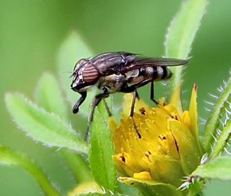 Quoi qu’il en soit, cet individu-ci ne déroge pas aux caractères dominants du genre. Petite taille (6 mm), naissance des ailes jaune, yeux rouge bordeaux, stabilisateurs blanchâtres bien visibles, pattes noires, longues et solides antennes… Par contre, membre de la grande famille des mouches tachinaires, il s’en distingue par l’absence de fortes soies noires tant sur l’abdomen que le thorax.