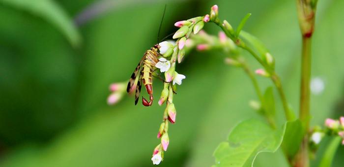 À défaut de passer en cuisine désormais, la Renouée poivre d’eau séduit plus que jamais les butineurs. Et pas seulement les papillons ! Même la Mouche-scorpion est tombée sous le charme…