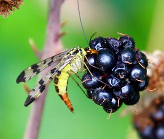 Tout cela est certes assez peu ragoutant. Mais la Mouche-scorpion sait aussi se faire délicate. Elle apprécie notamment nectar et pollen des fleurs. Puis, avec la fin de l’été, vient le temps d’une de ses principales gourmandises : les mûres ! Un jeu d’enfant pour le rostre que de percer la fine peau noire et luisante des petites drupes. Et d’en aspirer le jus sucré.