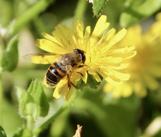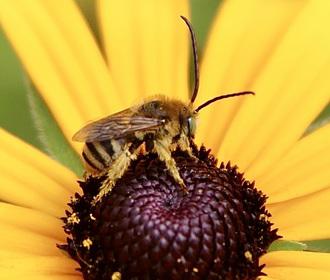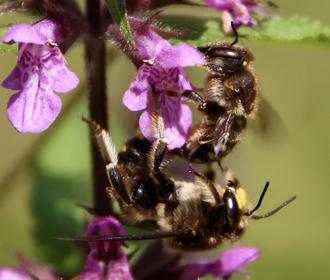 Madame en est dépourvue. Plus petite, on la distingue facilement à sa brosse ventrale blanche collectrice de pollen. Et tandis que ces messieurs paradent et se chamaillent, elle butine consciencieusement.