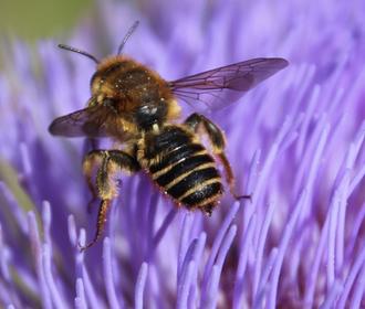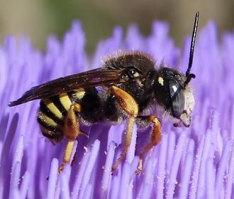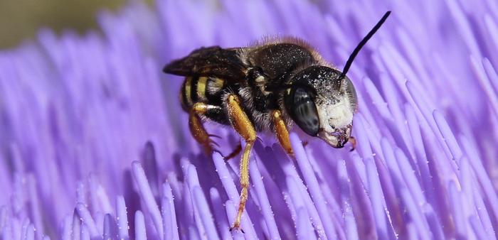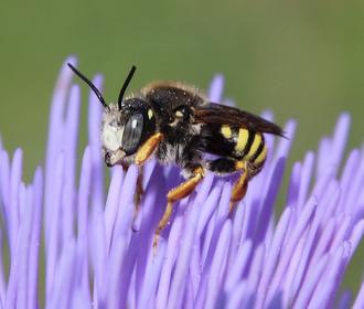 Ainsi, depuis plusieurs années, d’une génération l’autre, les Anthidies du jardin semblent avoir conclu une sorte de pacte territorial : la Mélisse officinale pour l’Anthidie à manchettes, les artichauts en fleurs pour l’Anthidie interrompue. Quant à l’Anthidie sept-épines, elle est persona non grata. Qu’importe : les salicaires sur le bord du halage lui vont très bien !