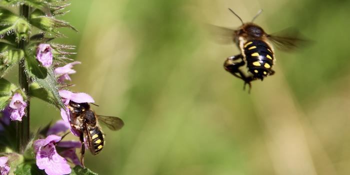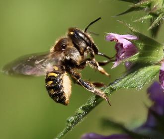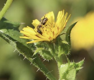 Autour de cette station d’Épiaire des marais, à quelques pas du halage, Monsieur Anthidie sept-épines (Anthidie septemspinosum) patrouille inlassablement. Concurrents et intrus sont brutalement chassés. Et gare aux fameuses épines s’ils insistent ! Elles arment la pointe de l’abdomen pour mieux lacérer les importuns…