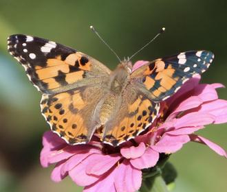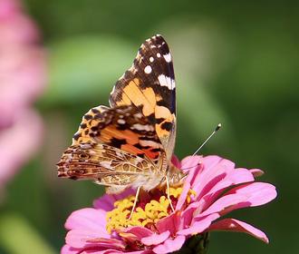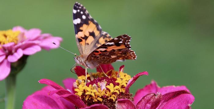 Elle est à son affaire ici la Belle-dame. Tournant méticuleusement sur elle-même, elle visite l’un après l’autre chacun des petits fleurons jaune vif. Le nectar semble lui plaire. Elle passe de capitule en capitule. Rose, blanc, rouge, orange… Qu’importe la couleur des pétales. Vive les fleurons. La couronne d’or des zinnias lui va si bien !