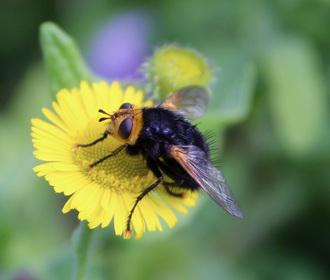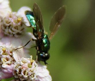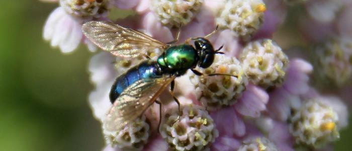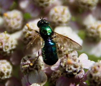 Malgré sa petite taille (7-9 mm), la Chloromyie agréable se repère donc facilement au jardin. Ici sur une inflorescence d’achillée. Et tant mieux si votre potager en accueille quelques-unes ! Friandes de matières organiques, leurs larves se développent ordinairement parmi les débris végétaux des sous-bois. Elles collaborent ainsi à la constitution de l’humus. Mais, à défaut, elles participeront volontiers à la « digestion » de votre tas de compost.