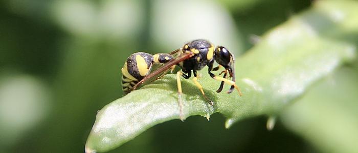 De ses pattes jaunes et noires, il se lisse consciencieusement la langue. Après avoir essuyé ses solides antennes. Langue et antennes : deux outils précieux. La première pour puiser le nectar. Les secondes pour localiser ses proies. Des petites chenilles anesthésiées et transportées jusqu’au nid où elles constitueront le garde-manger des futures larves.