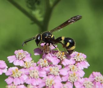 Dans la série des guêpes potières du jardin, on a déjà rencontré ici la petite Eumène pomiformis et, plus spectaculaire, l’Emmène unguiculé, aussi impressionnante que tranquille. Voici une cousine, l’Eumène couronné (Eumenes coronatus), à la toilette sur une bractée de rudbeckia.