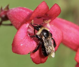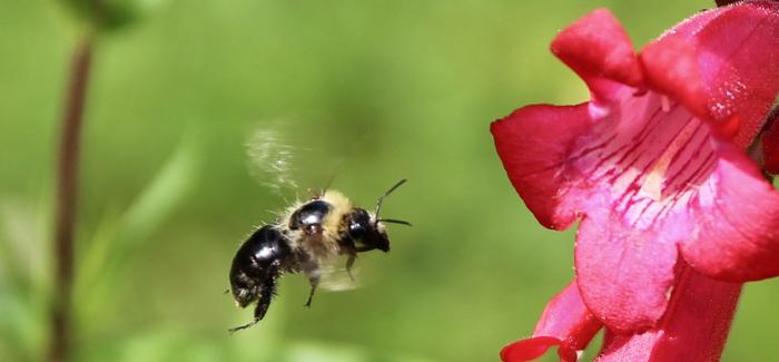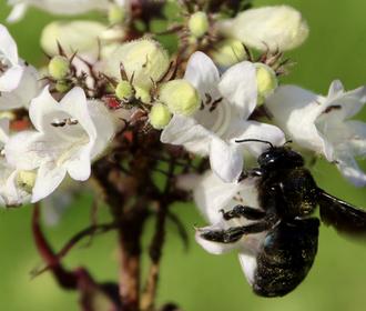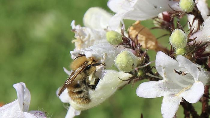 Familière du lumineux Penstémon rouge, l’Abeille charpentière apprécie également les fleurs blanches de son cousin, le Penstémon digitalis. Elle n’est pas la seule. Les bourdons y sont également assidus. Particulièrement le Bourdon des champs qui s’y engouffre encore et encore…