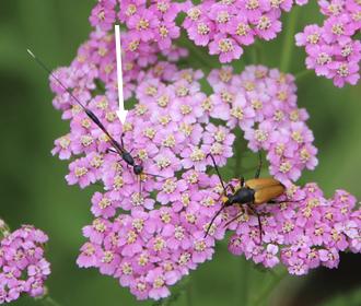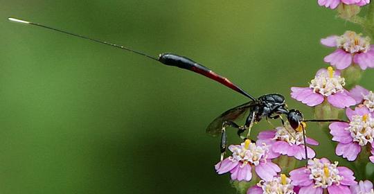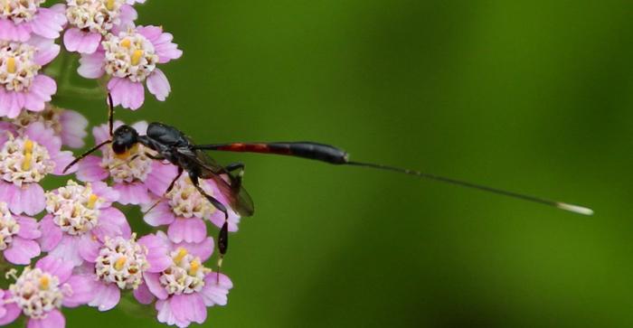 Dans la grande famille des Ichneumons, je demande… Celui-ci butine une inflorescence d’achillée. Il n’est pas bien gros. Plutôt filiforme et long. Très long. C’est évidemment la tarière de la femelle qui en accentue l’impression. Et comme pour mieux souligner la démesure, une tache blanche en marque la pointe.