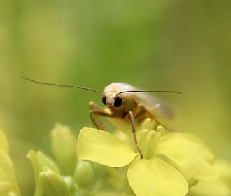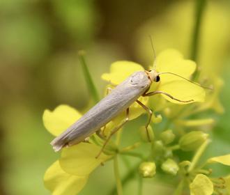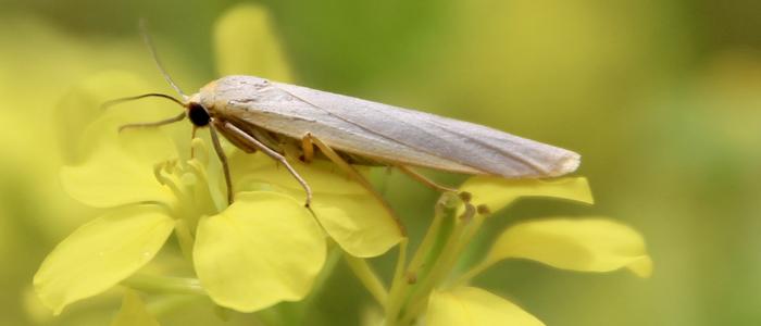 Dans la tribu des Manteaux, les ailes antérieures au repos s’enroulent autour du corps et donnent à ces petits papillons de nuit une silhouette fuselée caractéristique. Nocturnes, mais souvent encore visibles le matin, les différences espèces sont difficiles à distinguer. Ici sur la moutarde en fleurs, il s’agit sans doute du Manteau pâle (Eilema caniola) dans son long fourreau gris cendré nuancé de jaune clair.