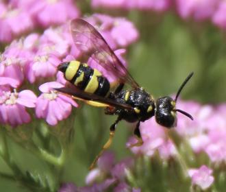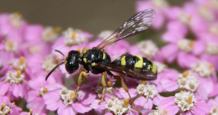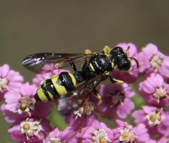 Toujours en mouvement, la Melline des champs (Mellinus arvensis) prend aussi le temps du butinage. Ici sur une inflorescence d’achillée, cette guêpe de taille moyenne (1,5 cm pour la femelle) ne rechigne pas devant pollen et nectar. Cela dit, c’est aussi une redoutable chasseuse de mouches !
