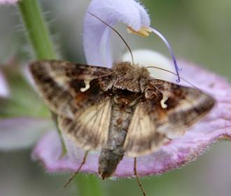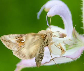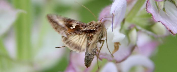 On a envie de lui demander de se calmer ! Tout en butinant, la trompe plongée dans le tube nectarifère ici de la Sauge toute-bonne, les pattes pourtant bien campées, la Noctuelle gamma (Autographa gamma) n’en finit pas de vibrer. Avec frénésie. Drôle de caractéristique de l’espèce !