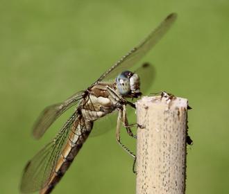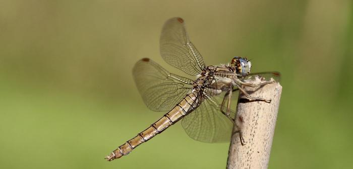 Brun vraiment ? On se souvient de Monsieur, rencontré l’été dernier au bord d’un fossé. Plus bleu que lui tu meurs ! Des yeux jusqu’à la pointe de l’abdomen. Quant à Madame, avec une dominante brun pâle mâtinée de jaune, la confusion est possible avec d’autres femelles Orthétrum.
