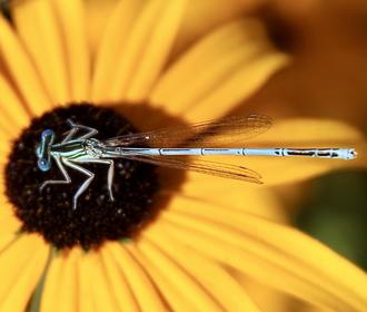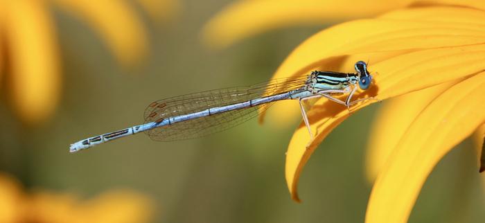 L’histoire ne dit pas si l’attribut est objet de séduction. C’est avant tout une arme redoutable. Lorsqu’il est à l’affût, l’agrion se jette en effet sur les petits insectes volant à proximité. Comme autant de puissants râteaux, ses tibias se referment alors sur les proies qui, prisonnières, sont ramenées sur un bouton de rudbeckia pour dégustation.