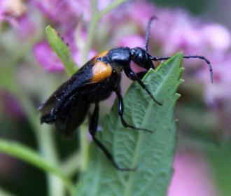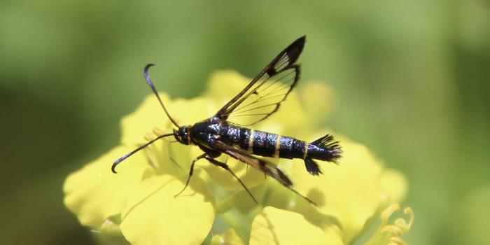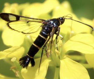 Voilà donc une petite Sésie à dominante noire. Simplement rehaussée, non pas de rouge-orangée comme sa parente de l’oseille, mais de jaune : trois anneaux abdominaux pour la femelle ici, quatre pour le mâle. Le jaune plus ou moins soutenu s’invite également, par petites touches, sur les pattes, autour du « cou », sur les côtés du thorax et sur les ailes par ailleurs essentiellement hyalines et noires.