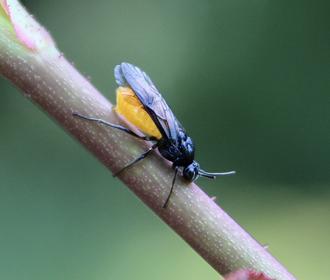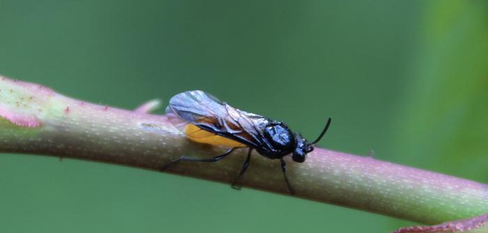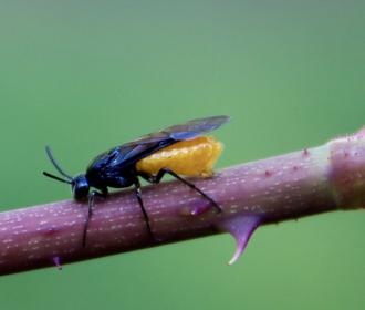 C’est peu dire qu’elle ressemble à la Tenthrède de la ronce. Même silhouette noire-jaune ramassée, même petite tête aux solides antennes le plus souvent relevées, même thorax aux reflets bleutés creusé de sillons épais… Mais les pattes de la Tenthrède du rosier (Arge pagana) sont entièrement noires. Et ses ailes fortement fumées.