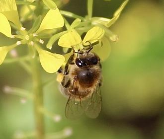 Dépourvu de brosses blanches collectives de pollen aux pattes arrière, c’est là un mâle. Attablé sur la planche de moutarde blanche, il fait honneur à son nom populaire. Mais, en ce début de printemps, on peut également le rencontrer sur l’aubépine des haies comme sur les derniers fruitiers en fleurs.