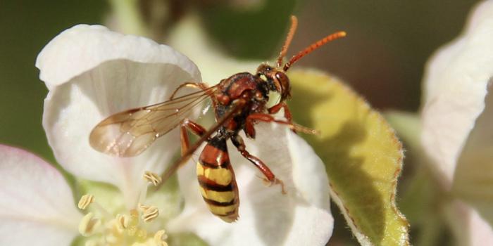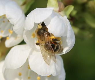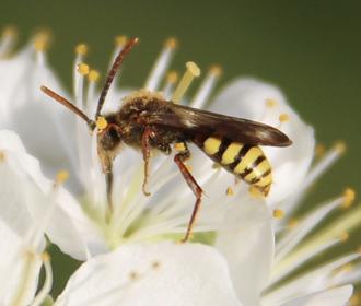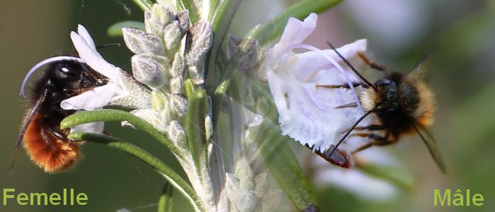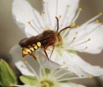 Elle vient d’émerger depuis quelques jours et fréquente assidûment les fruitiers du jardin. Mâles et femelles ont à peu près la même taille. Difficile de les distinguer. D’autant que Madame ne porte pas de brosses collectrices de pollen aux pattes arrière. Pas la peine : c’est une abeille-coucou !