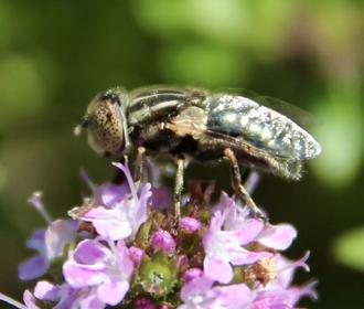 On a déjà rencontré ici l’Éristale bronzé (Eristalinus aeneus), alias l’Éristale aux yeux mouchetés, en automne, sur les capitules du Bident feuillé. Le revoici au printemps sur la sarriette en fleurs. Il est vrai que ce petit syrphe trapu est quasi omniprésent dans le marais. De mars à novembre.