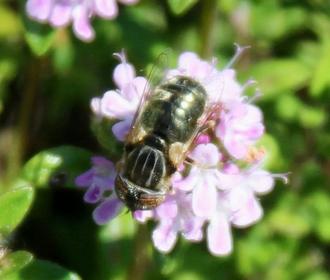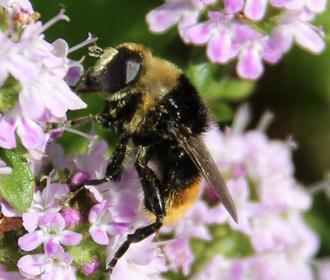 Ceinture jaune et « cul roux » : on songe bien sûr au petit Bourdon des prés dont les jeunes reines sont déjà sur le pont depuis quelques semaines. Mais c’est bien une mouche. Avec de gros yeux sombres et velus. Disjoints ici puisqu’il s’agit d’une femelle qui arbore en outre un toupet touffu fauve sur le dessus de la tête.