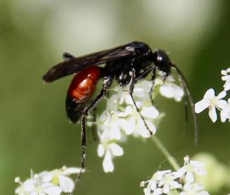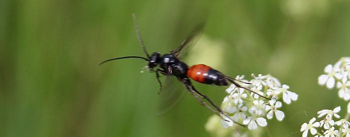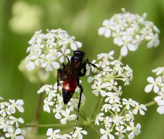 Svelte, noire, les ailes fumées, les premiers segments de l’abdomen rouge-orangé et de très longues pattes épineuses… Voilà une petite guêpe de la famille Pompile qui compte une centaine d’espèces en Europe, très difficiles à distinguer entre elles. Pompile sp donc. Elle furète ici parmi les ombelles du cerfeuil sauvage. Ses longues antennes, toujours en mouvements, traquent inlassablement ses proies.