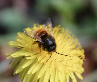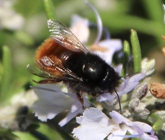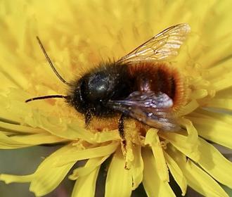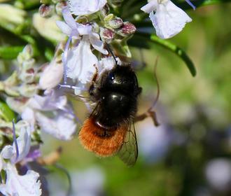 Dans la famille Osmie, la collecte du pollen passe par une brosse ventrale. Ni orangée ni rouge, elle est ici plus discrète, entièrement noire. Puisque l’accouplement vient d’avoir lieu, la récolte va bientôt commencer.
