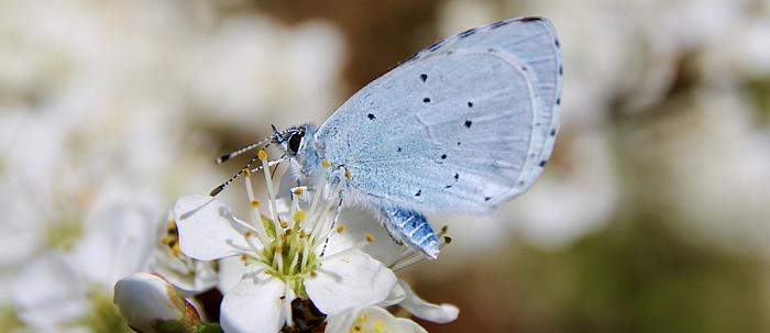 Dans la famille des Azurés, alias les « Petits bleus », voilà bien le plus précoce. Depuis une quinzaine de jours déjà, l’Azuré des nerpruns (Celastrina argiolus) visite les haies en fleurs. Il y affectionne particulièrement les prunelliers. Et lorsqu’il s’aventure au jardin, c’est plutôt pour siroter le nectar de la Moutarde blanche. En attendant l’explosion des fruitiers.