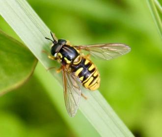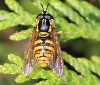 Comme la guêpe commune, il arbore un costume noir rayé et taché de jaune, des ailes ambrées aux bordures orangées, des pattes jaunes aux fémurs noircis à la base… Il pousse en outre le mimétisme jusqu’à étirer ses solides antennes, très longues pour une mouche, dressées à l’avant d’une face triangulaire jaune… Mais, en bon syrphe, il arbore d’énormes yeux réniformes, un thorax barré de gris et un scutellum en demi-lune, bien contrasté, en l’occurrence jaune taché de brun roussâtre.