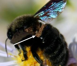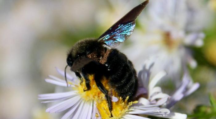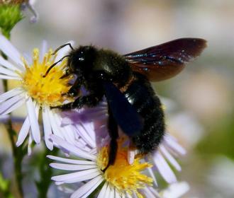 Tout juste émergée et déjà parasitée ! La Charpentière et les acariens : triste de fable en vérité. Car le Xylocope violacé, alias l’Abeille charpentière (Xylocopa violacea), a beau prendre des forces sur le massif d’asters, il risque fort de ne jamais voir le printemps…