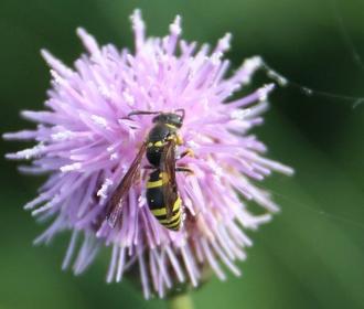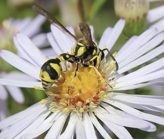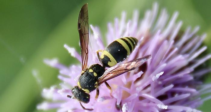 Pour ne parler que des « jaunes et noires », toutes viennent ici au fil des saisons s’abreuver de nectar. Et chasser à l’occasion pour garnir le garde-manger de leur progéniture. Leurs proies ? Le plus souvent des chenilles, voire même des papillons adultes pour la petite Lestica clypeata par exemple qui jette son dévolu sur des ravageurs du genre pyrale.